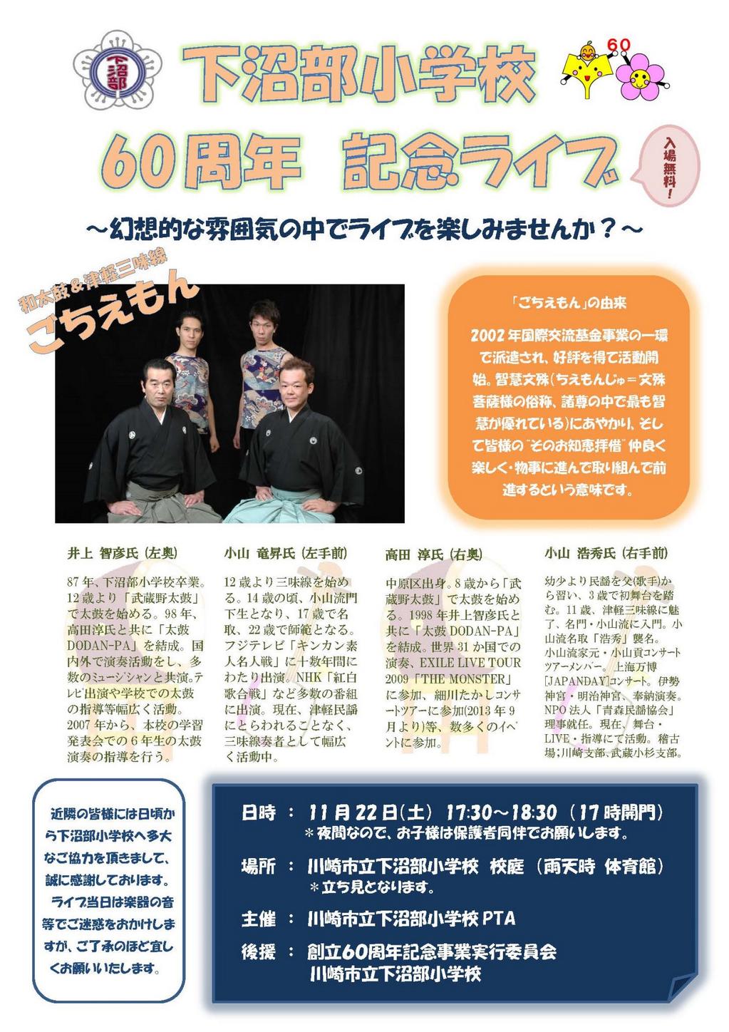 ■「下沼部小学校60周年記念ライブ」案内チラシ ※クリックで拡大します。