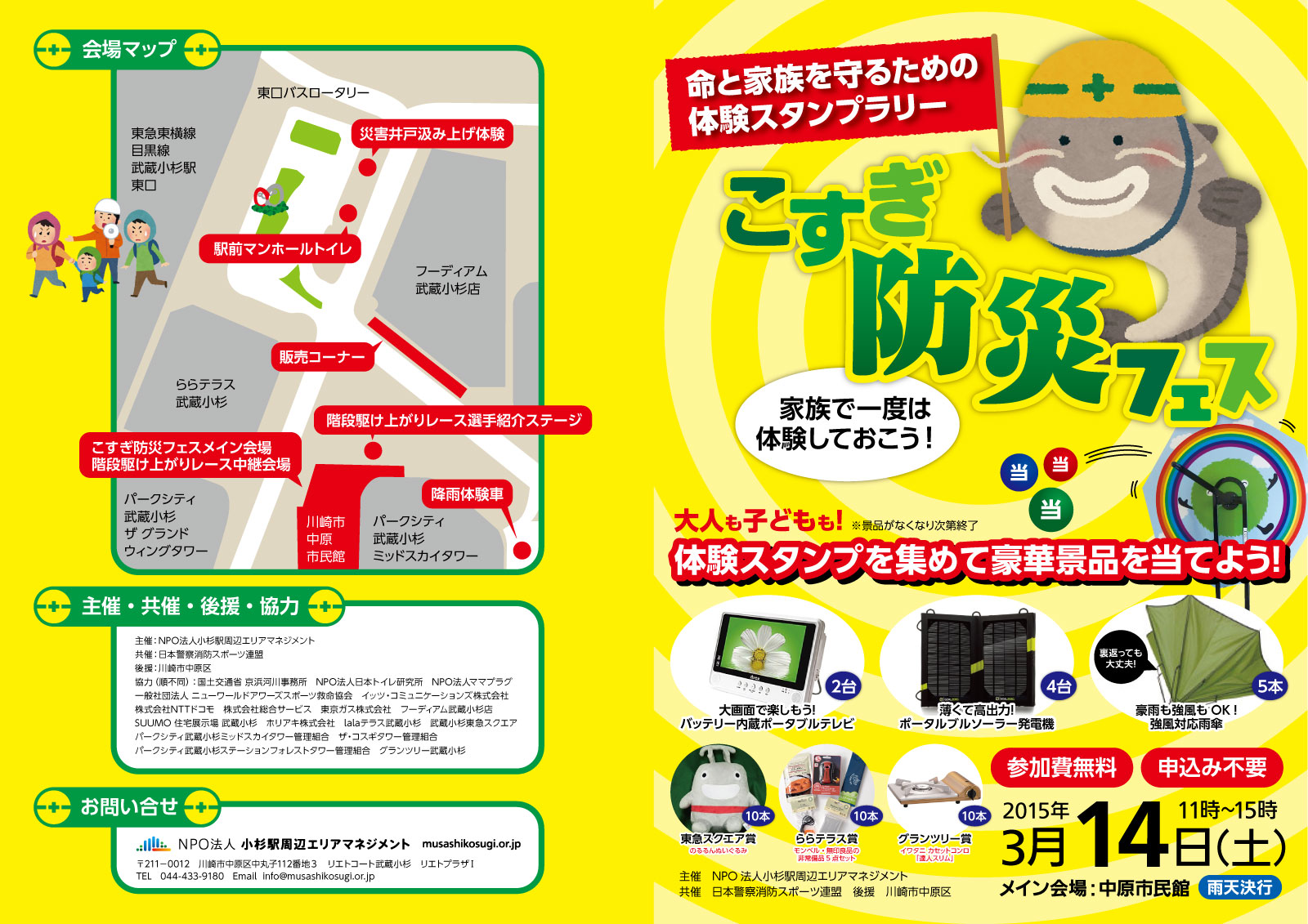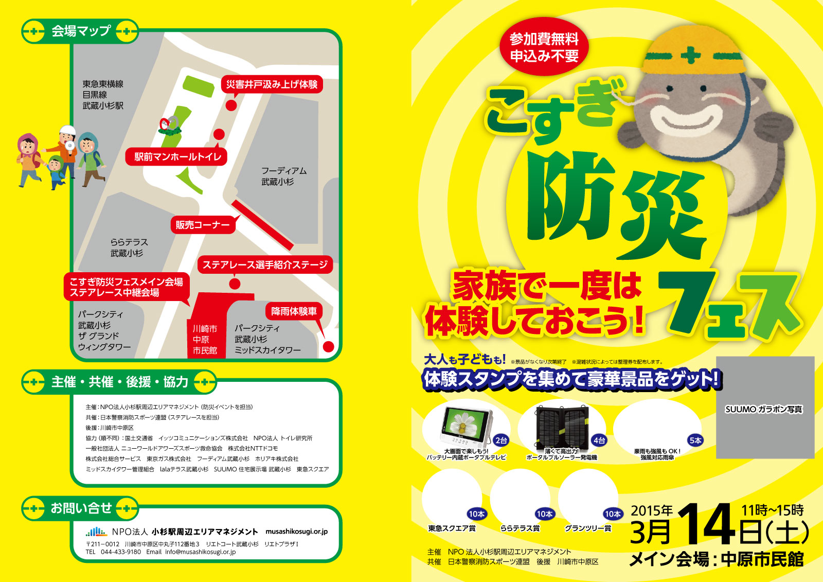 2015年3月14日(土)に、NPO法人小杉駅周辺エリアマネジメントによる「こすぎ防災フェス」が開催されます。