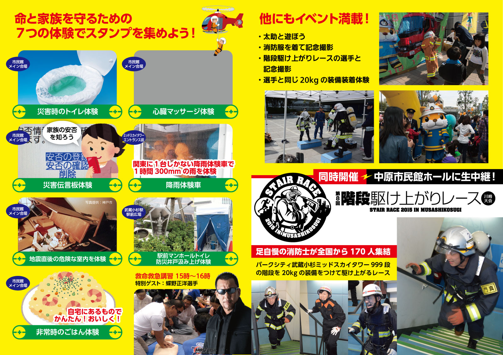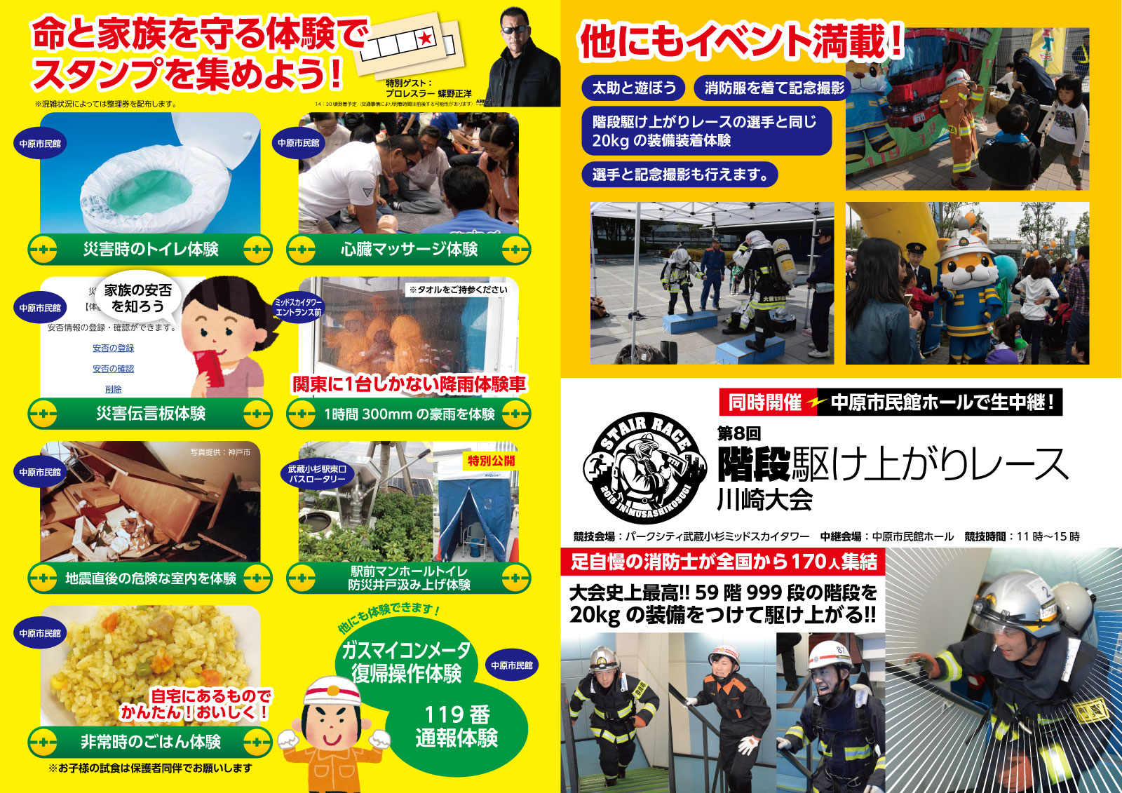 本イベントは中原市民館をメイン会場とし、共催の日本警察消防スポーツ連盟による「第8回階段駆け上がりレース川崎大会」(Stair Race in MUSASHIKOSUGI)が同時開催されます。