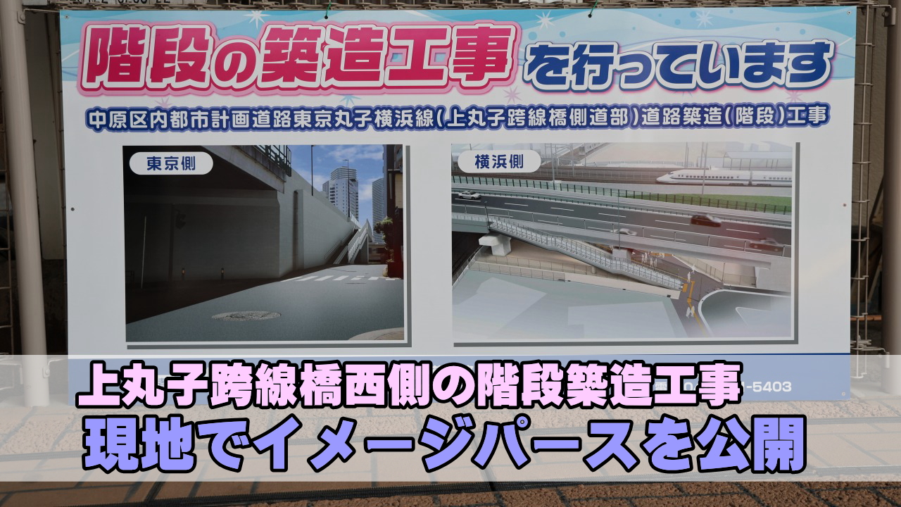 イメージパースは、上丸子跨線橋西側の階段築造工事現場の現地に掲示されています。