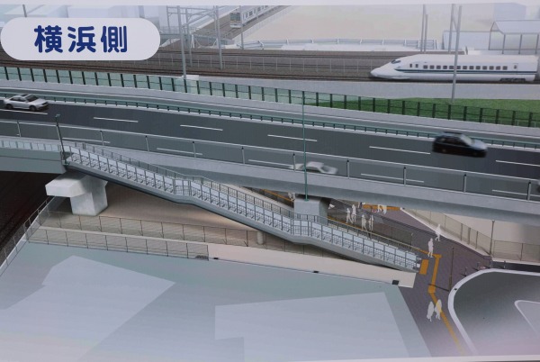 綱島街道・上丸子跨線橋西側の歩行者&自転車導線向上はかる階段築造工事進む、現地でイメージパースを公開