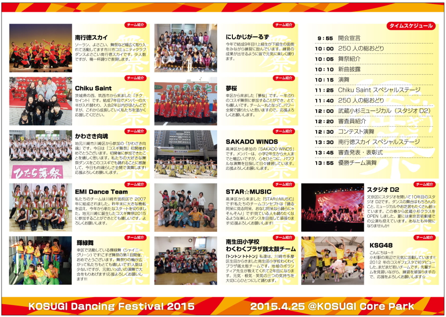 今回の「こすぎ舞祭」には、川崎市内の実力派チームに加えて千葉・茨城からも遠征チームが来るほか、コスギフェスタなどでおなじみの「KSG48」も地元・小杉チームとして参戦します。