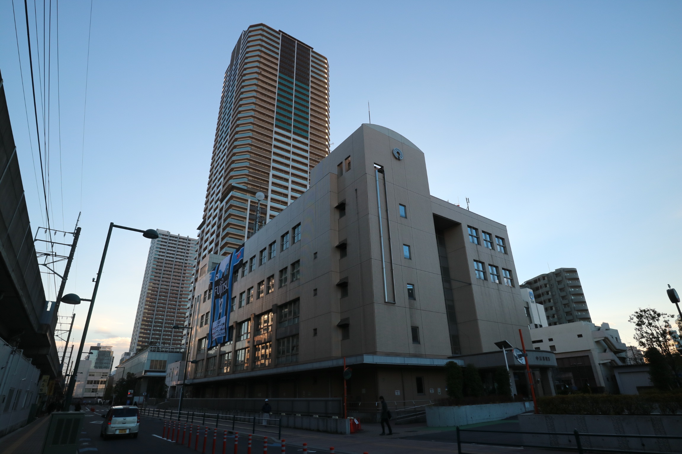 中原区役所の壁面に、天皇杯を戦う川崎フロンターレを応援するビッグフラッグが登場しました。