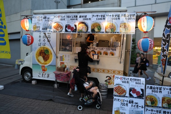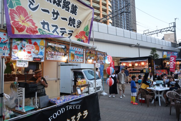 武蔵小杉駅南口駅前のこすぎコアパークを会場に、沖縄グルメのキッチンカーやステージ、客席などが並びました。