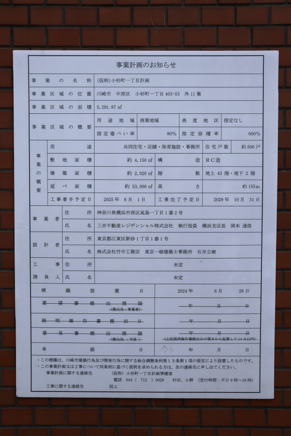 今後三井不動産レジデンシャル・竹中工務店による商業・業務施設併設のタワーマンションが建設されます。