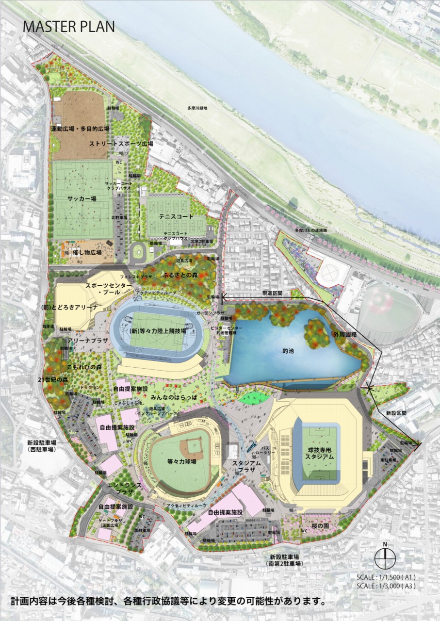 加えて、等々力球場北側に予定されていた自由提案施設2棟と、「レインガーデン(親水空間)」も中止になりました。