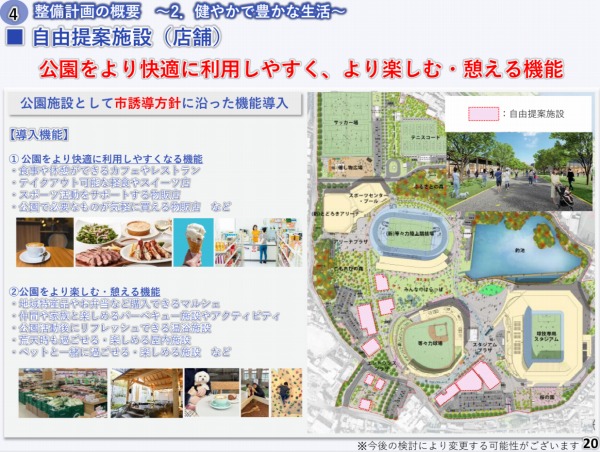 カフェ、レストラン、スポーツショップ、マルシェ、バーベキュー施設や温浴施設、ペット関連施設などが計画されていますが、昨今の著しい建設コスト上昇と収益性を勘案して見直しが行われたということです。