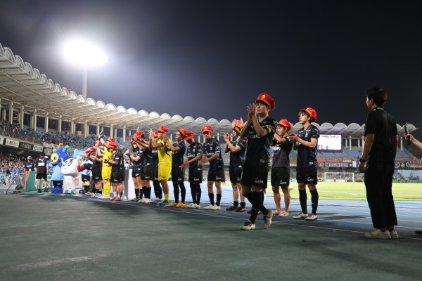 本日はホームゲームイベント「川崎の車窓から~東急グループフェスタ~」が6年ぶりに開催されましたので、試合終了後の挨拶は「のるるん帽子」をかぶっての一周でした。