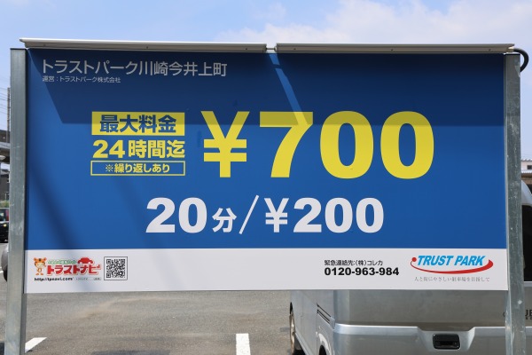 トラストパーク川崎今井上町は、現時点で20分200円、24時間迄最大料金700円です。