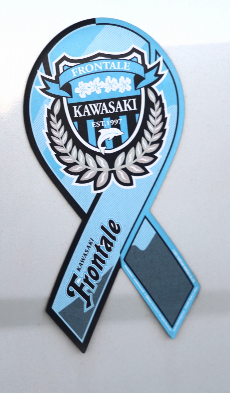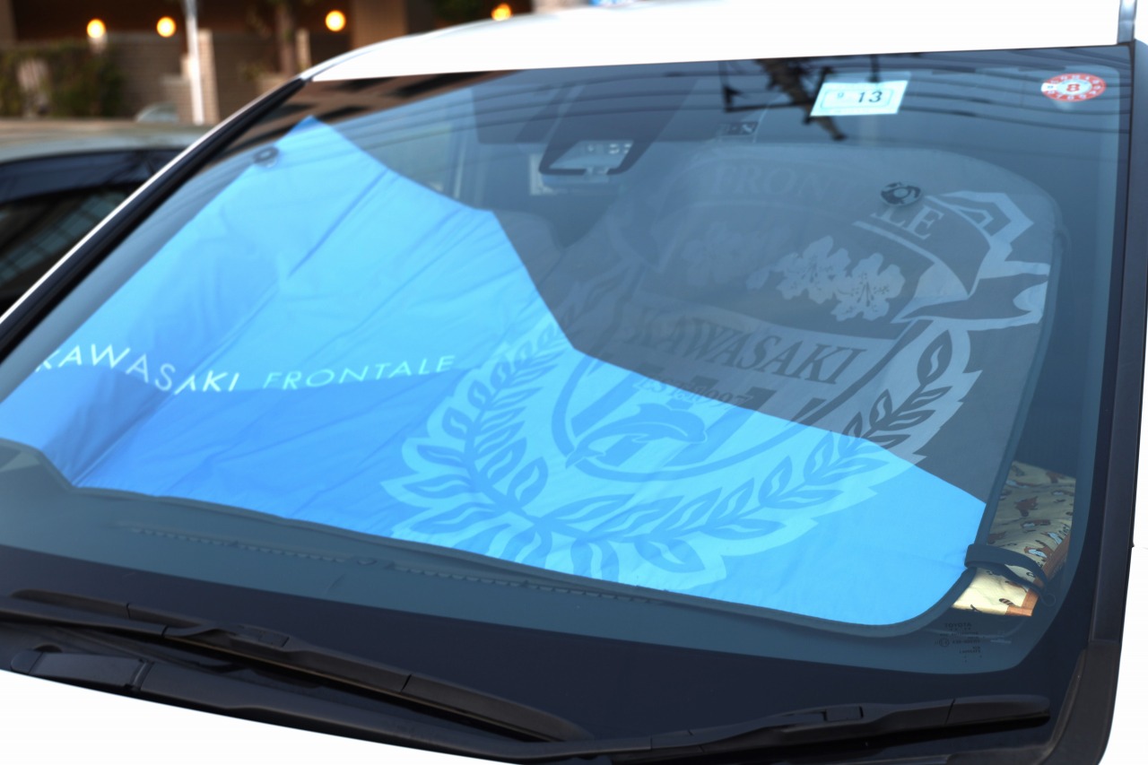 そして並ぶクルマを見てみると、川崎フロンターレのフロントシェードやリボンマグネットが多数見つかりました。