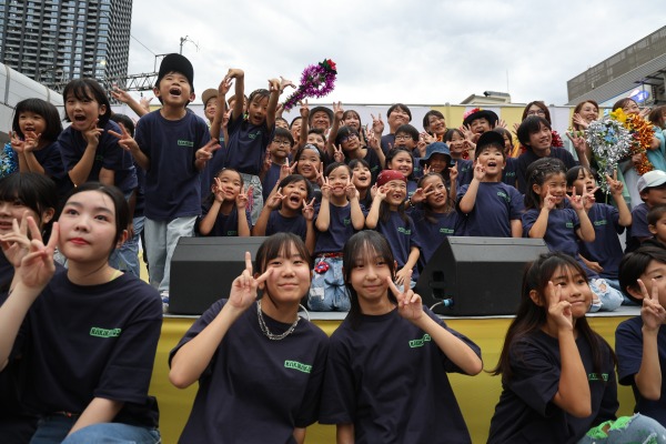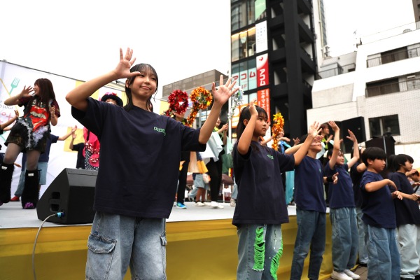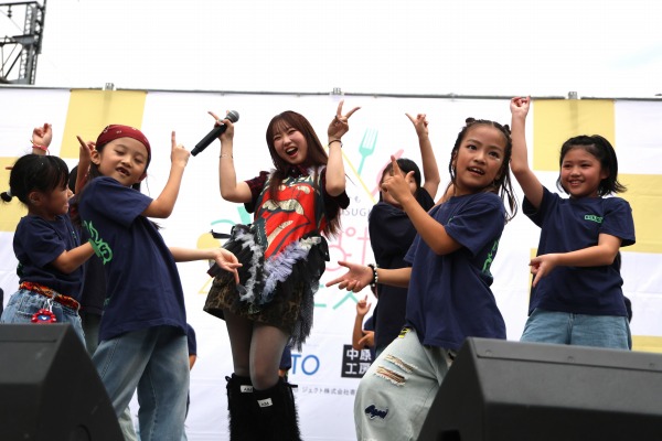 今回は宮前区・中原区で活動するダンスチーム「RAKIRAKIDS」とのコラボステージで、子どもたちの躍動感あるダンスと荒井麻珠さんの歌が、見事にシンクロしていました。