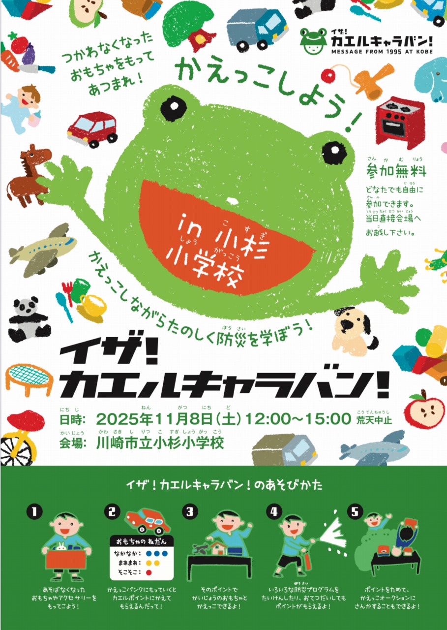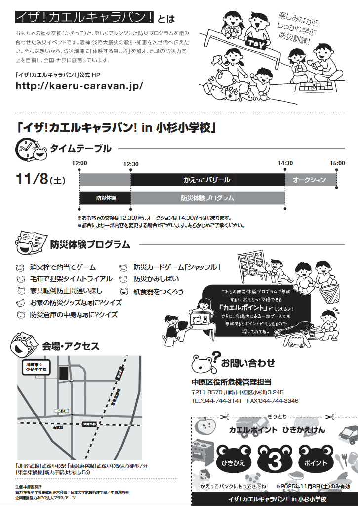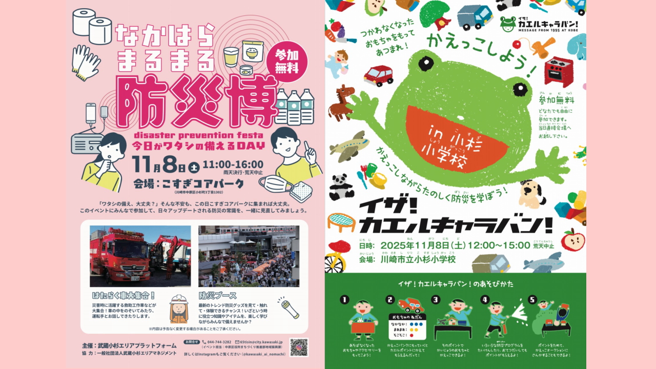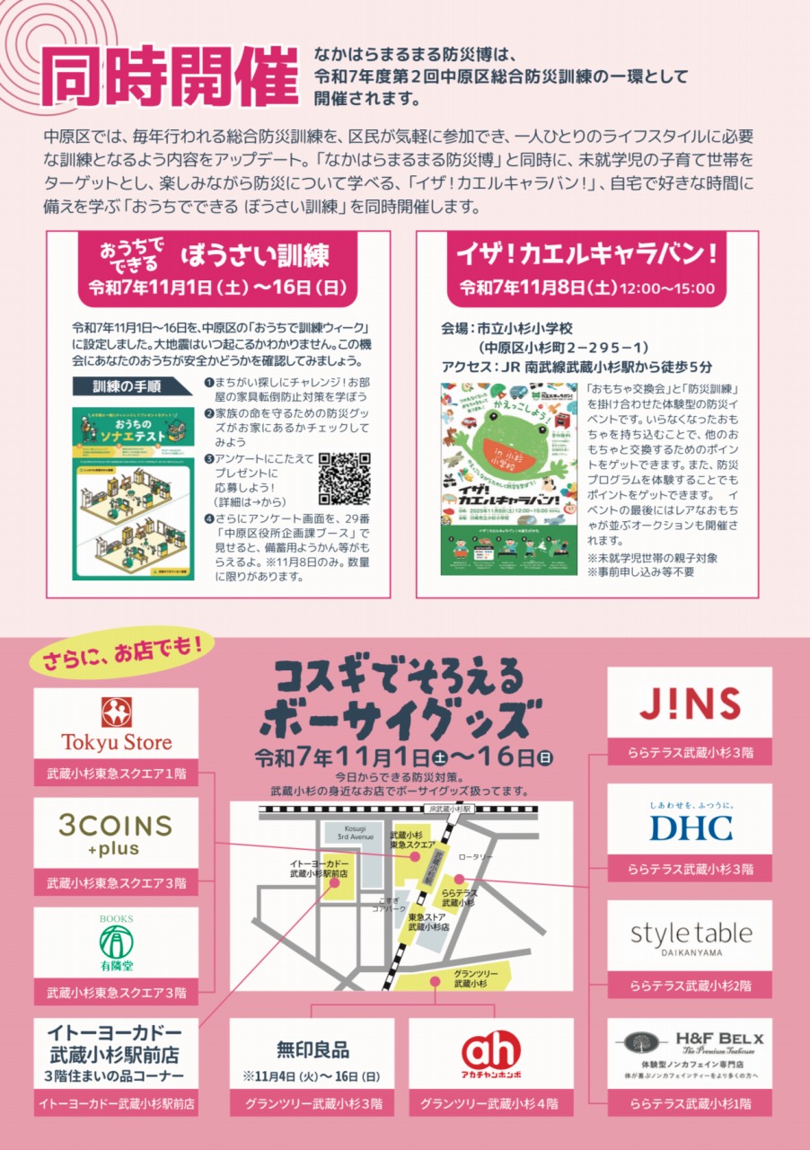 今回はこすぎコアパークや身近なお店で防災啓発を行う「なかはらまるまる防災博」に加えて、未就学児の子育て世代をターゲットとした「イザ!カエルキャラバン!」、さらに自宅で好きな時間に備えを学べる「おうちでできる ぼうさい訓練」が同時開催されます。