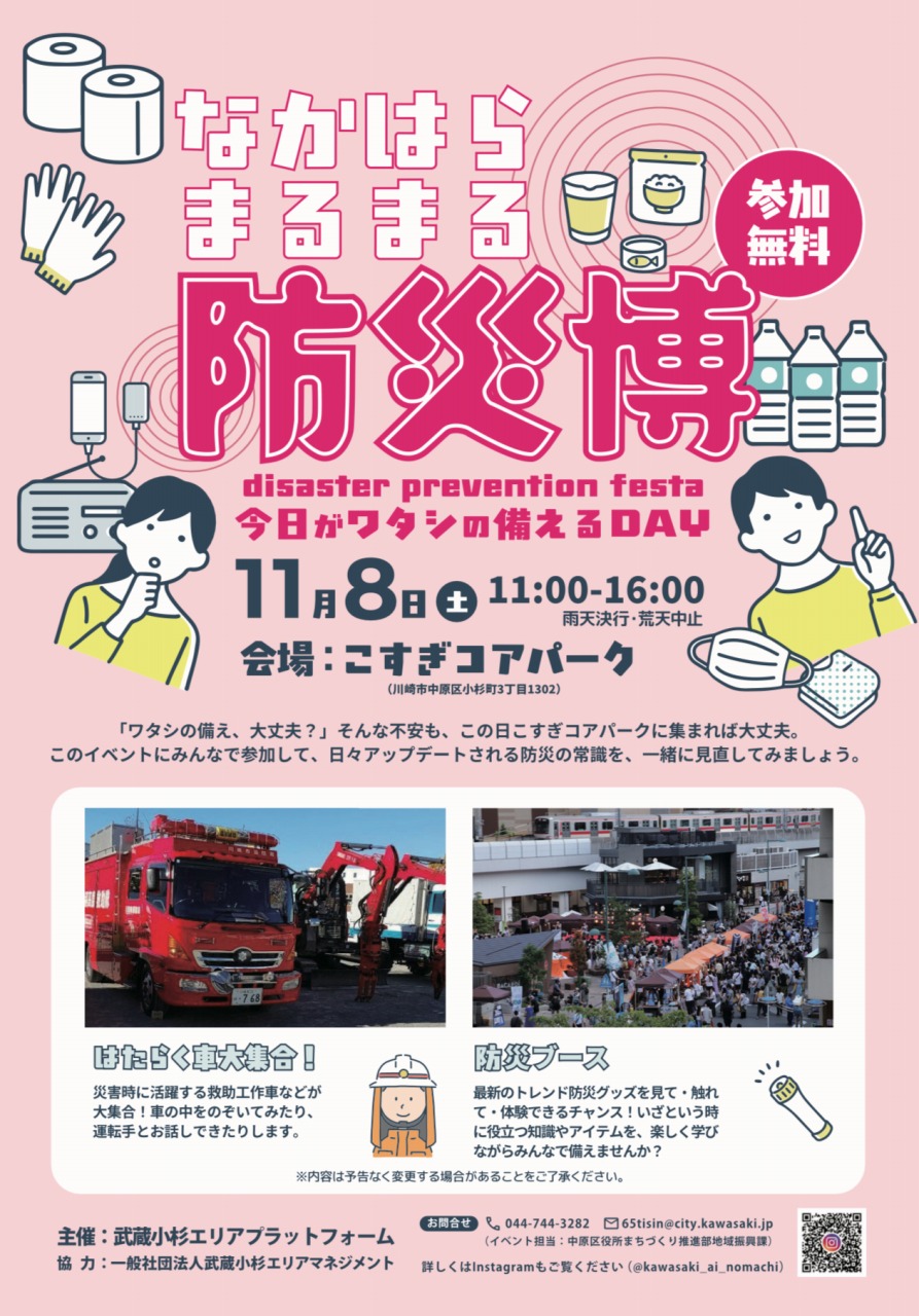 | 内容 | 「ワタシの備え、大丈夫?」そんな不安も、この日こすぎコアパークに集まれば大丈夫。このイベントにみんなで参加して、日々アップデートされる防災の常識を、一緒に見直してみましょう。 |