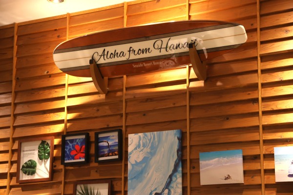 店内はハワイアンダイニングらしい装いで、サーフボードなどが飾られていました。