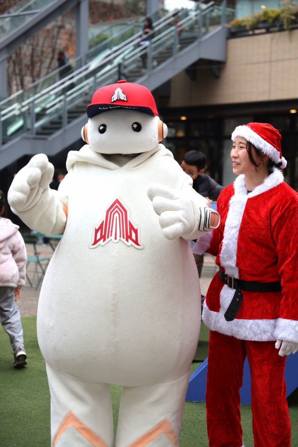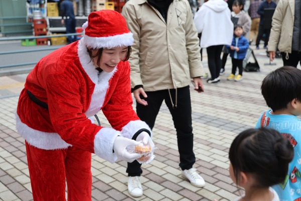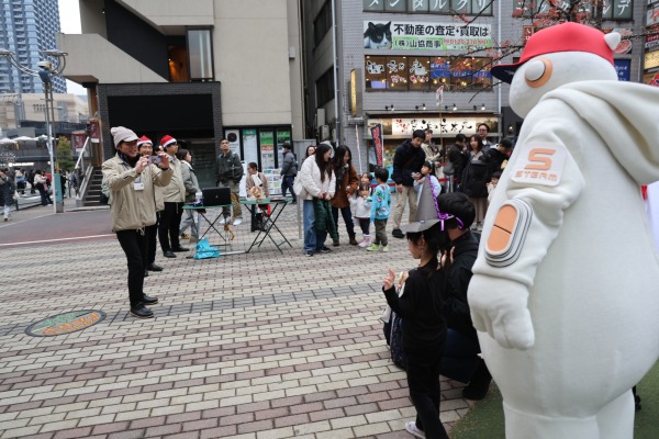 サンタクロースとともにNECレッドロケッツ川崎のマスコットキャラクター「キャプテンスティーム」も登場し、先着333名のお子さんにドーナツのプレゼントがありました。