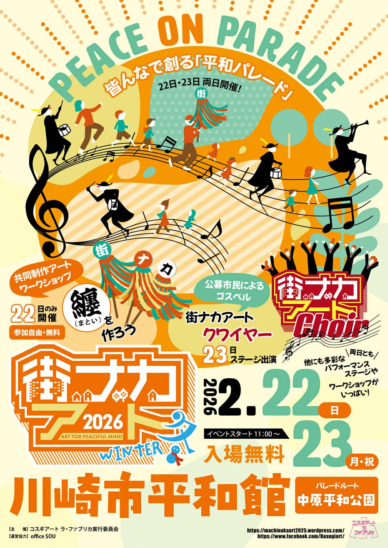 | 内容 | 街ナカアートのステージで!一緒にゴスペルを歌おう!! 街ナカアートChoir!参加者募集!! 参加型アートフェス『街ナカアート』では、来たる2026年2月22日(日)、23日(月祝)の二日間、川崎市平和館にて『街ナカアート2026 Winter』を開催します。 今回は特別企画として、公募市民による、街ナカアート(ゴスペル)クワイヤー、略して『マチクワ』を結成し、ステージのフィナーレを飾っていただきます! 講師はあの!In Unityでのゴスペル企画 『ゴッパチ』の指導でお馴染みの、吉田英樹先生です。 参加は小学生からOK!年齢上限は無し、かつ経験不問。寿命ある限り歌い続けたい方!大歓迎!! ご応募お待ちしています。 |