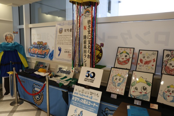 両者の絆の象徴のひとつともいえる、川崎フロンターレのマスコット「カブレラ」と、陸前高田市のマスコット「たかたのゆめちゃん」の間に生まれた子ども「メーカブー」のイラストも展示されていました。