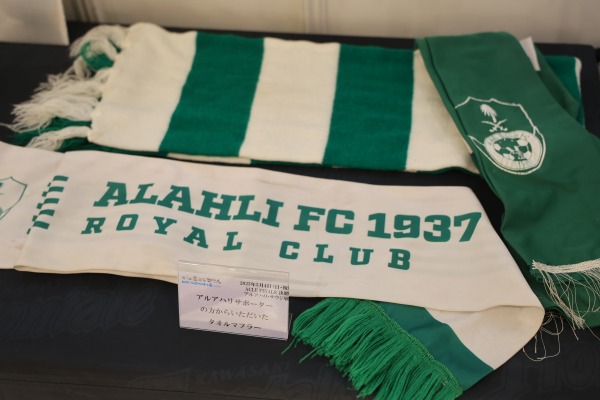 対戦した「アルアハリ」サポーターの方からいただいたという、タオルマフラーが展示されていました。