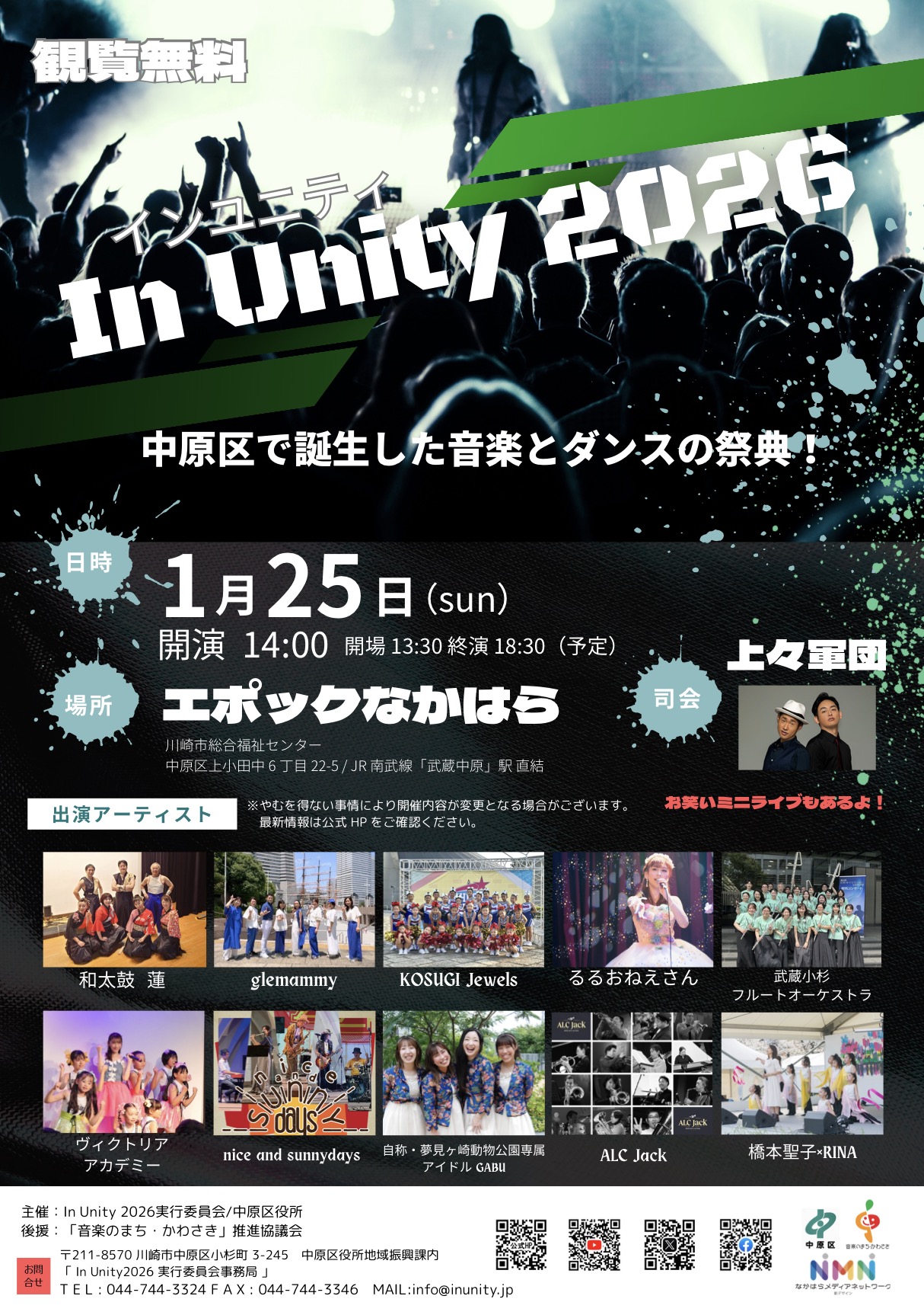 中原区の音楽とダンスの祭典「In Unity2026」が、1月25日(日)にエポックなかはらで開催されます。