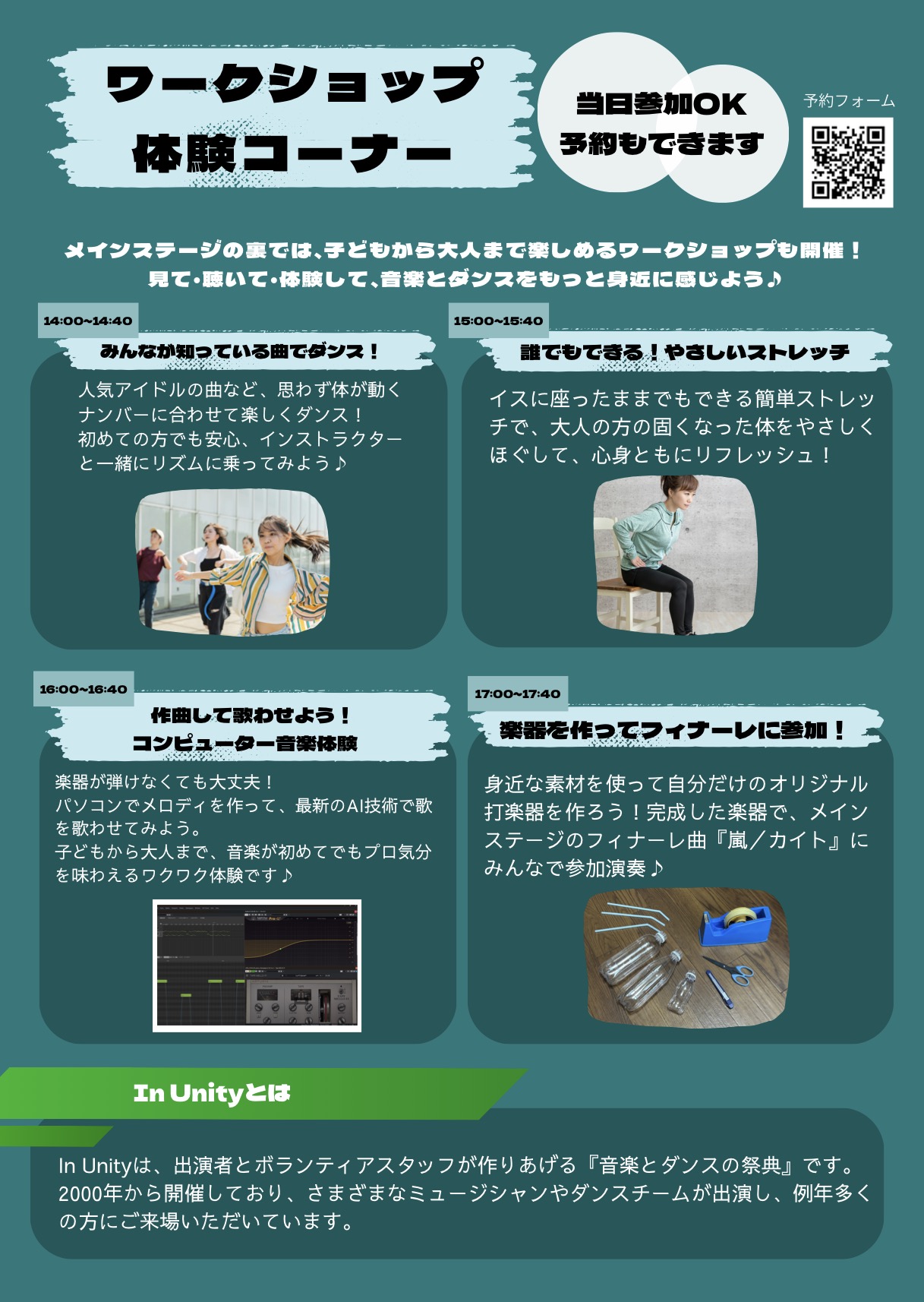 また新企画として大人から子どもまで楽しめる、音楽・ダンス等に関連するワークショップが開催されます。