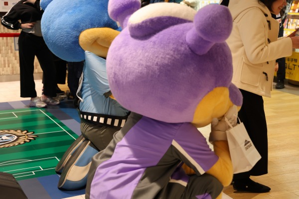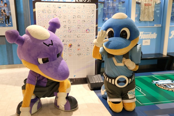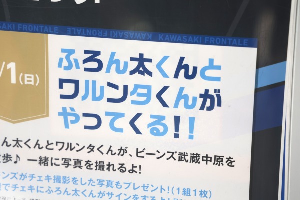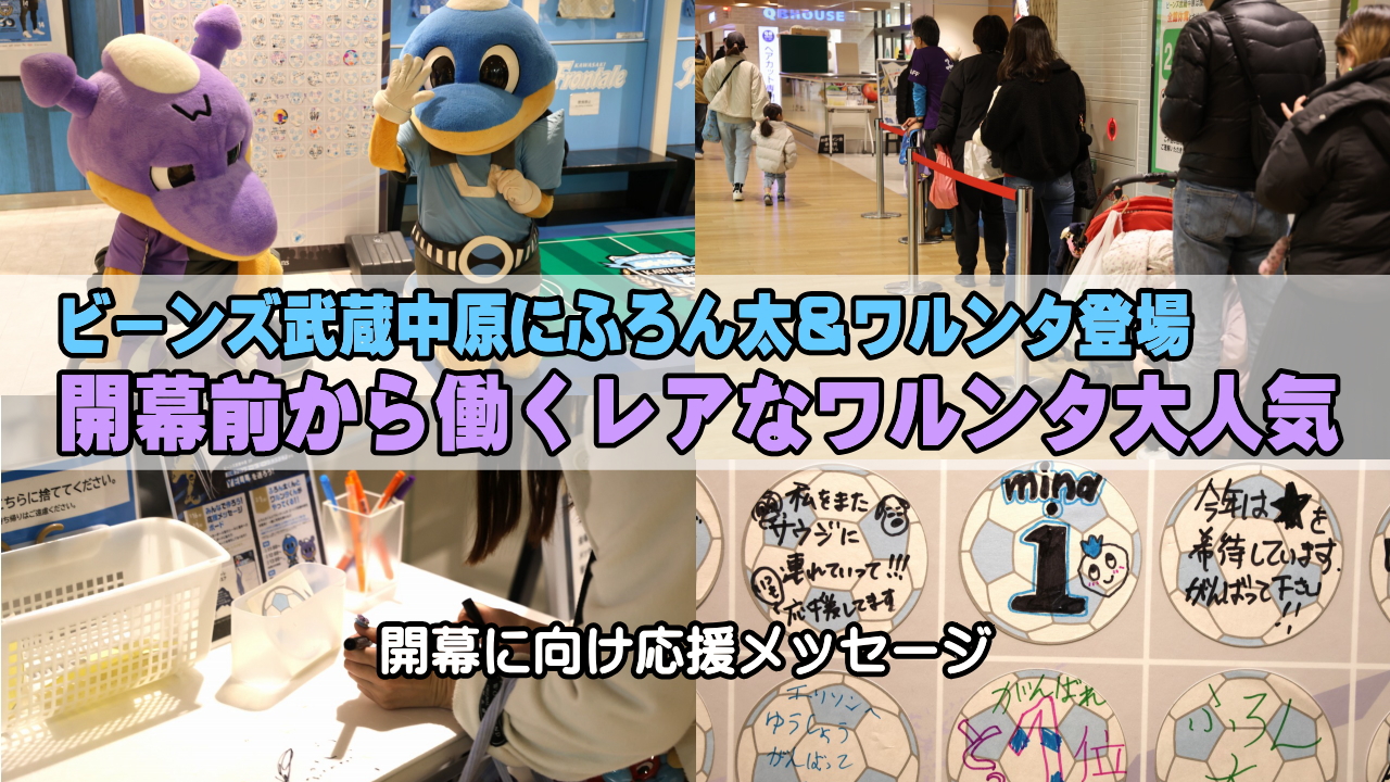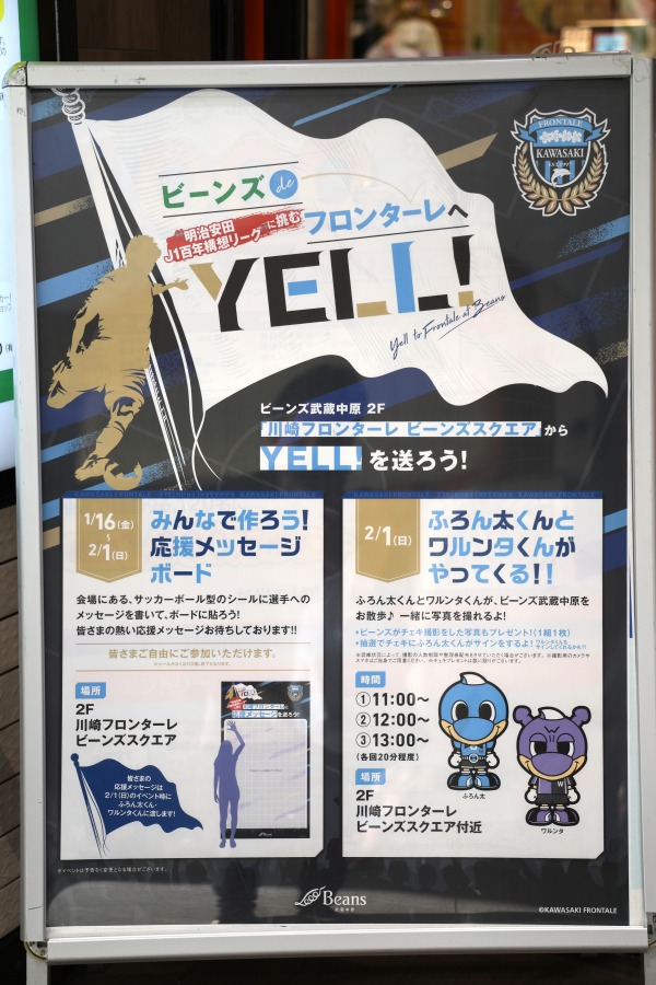 今回はこのシーズン開幕を控えて、JR武蔵中原駅直結の高架下商業施設「ビーンズ武蔵中原」において川崎フロンターレへの応援メッセージを募集するとともに、2月1日にはふろん太・ワルンタの撮影会が開催されたものです。