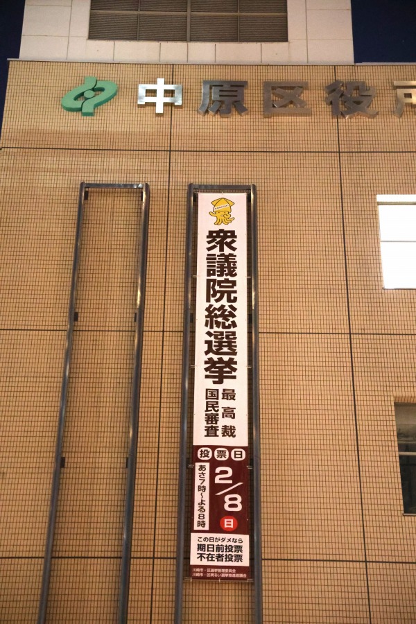 中原区役所には、投票日を告知する懸垂幕が出ていました。