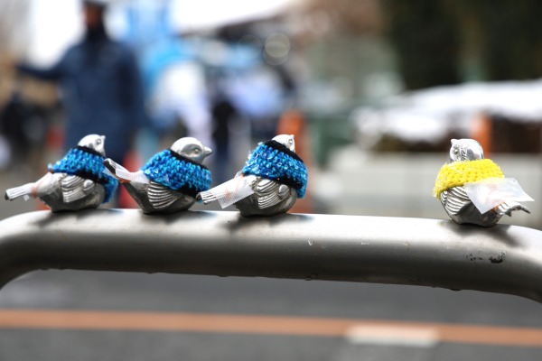 等々力緑地にある、小鳥のオブジェ付き車止め「ピコリーノ」に、手編みの衣装が着せられるのが今年もまたスタートしました。