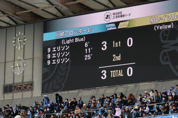 エースストライカーのエリソンがクラブ史上最短となる25分でのハットトリックを決めるなどして、両クラブ8得点が飛び交う乱打戦を川崎フロンターレが5-3で制しました。