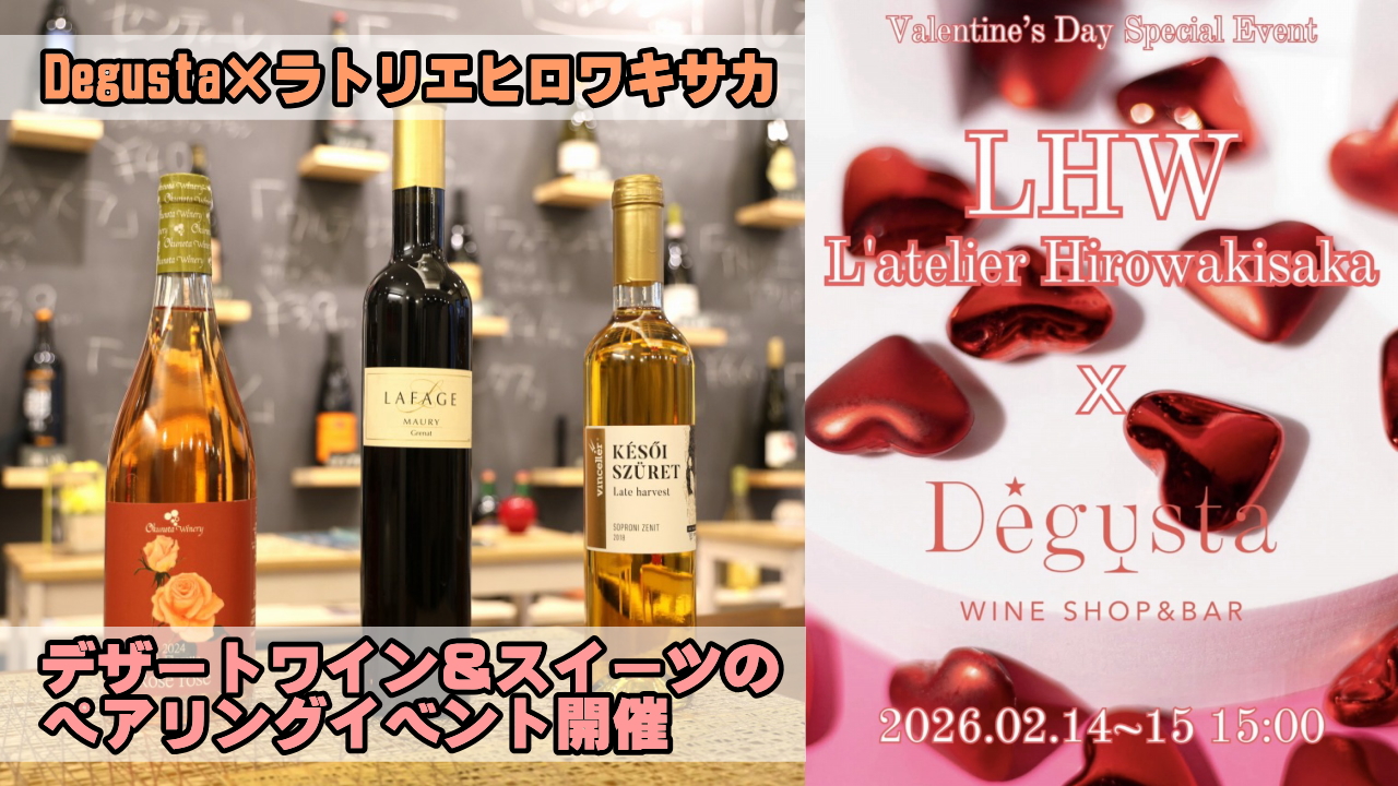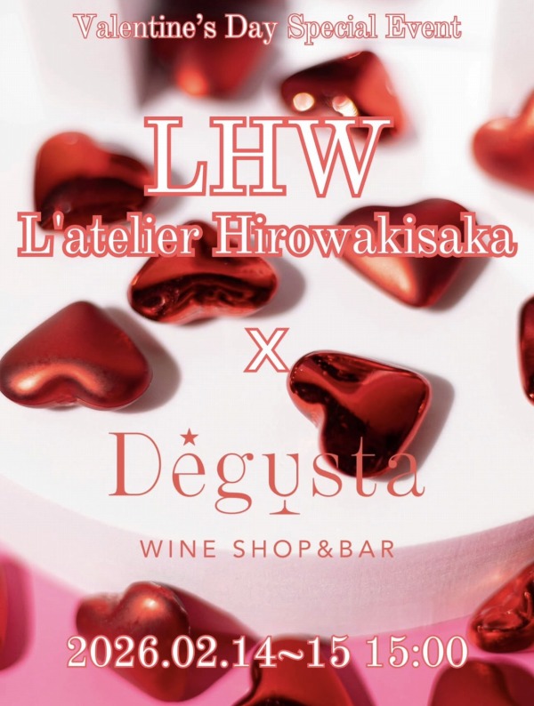 新丸子の「WINE SHOP & BAR Degusta(ワインショップ&バー デグスタ)」が、武蔵小杉の洋菓子店「ラトリエヒロワキサカ(L'ATELIER HIRO WAKISAKA、LHW)」とのコラボイベントを2026年2月14日(土)15日(日)に開催します。