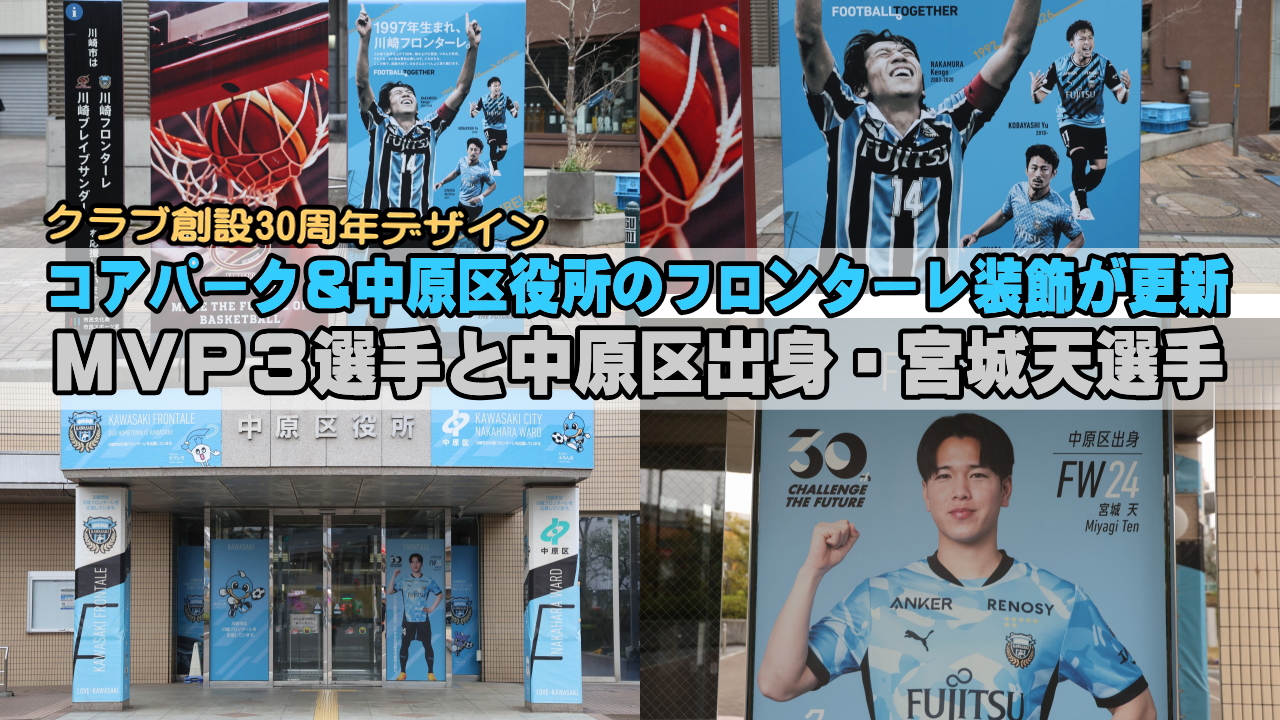 ■こすぎコアパーク&中原区役所の川崎フロンターレ装飾が30周年版に更新、MVP3選手と中原区出身・宮城天選手が登場