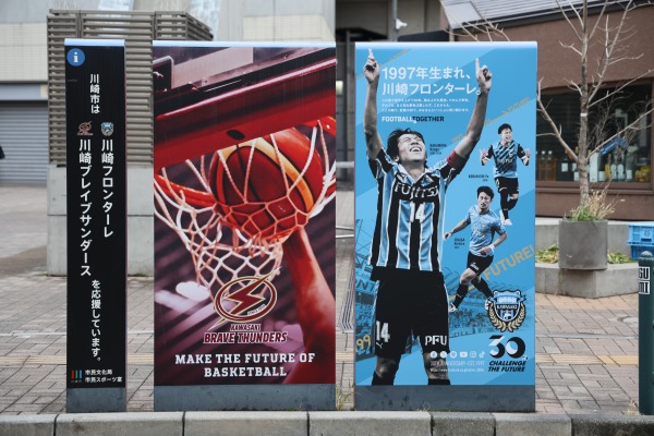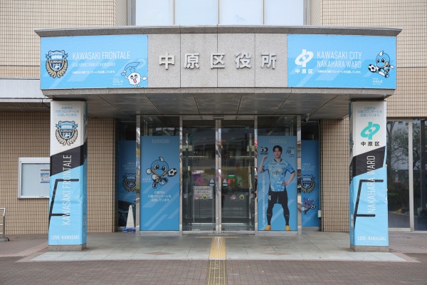 こすぎコアパーク&中原区役所の川崎フロンターレ装飾が30周年版に更新、MVP3選手と中原区出身・宮城天選手が登場