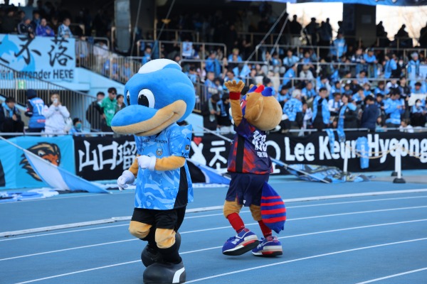 通常、アウェイチームのマスコットはホーム側までは来ないのですが、これも「多摩川クラシコ」ならではですね。