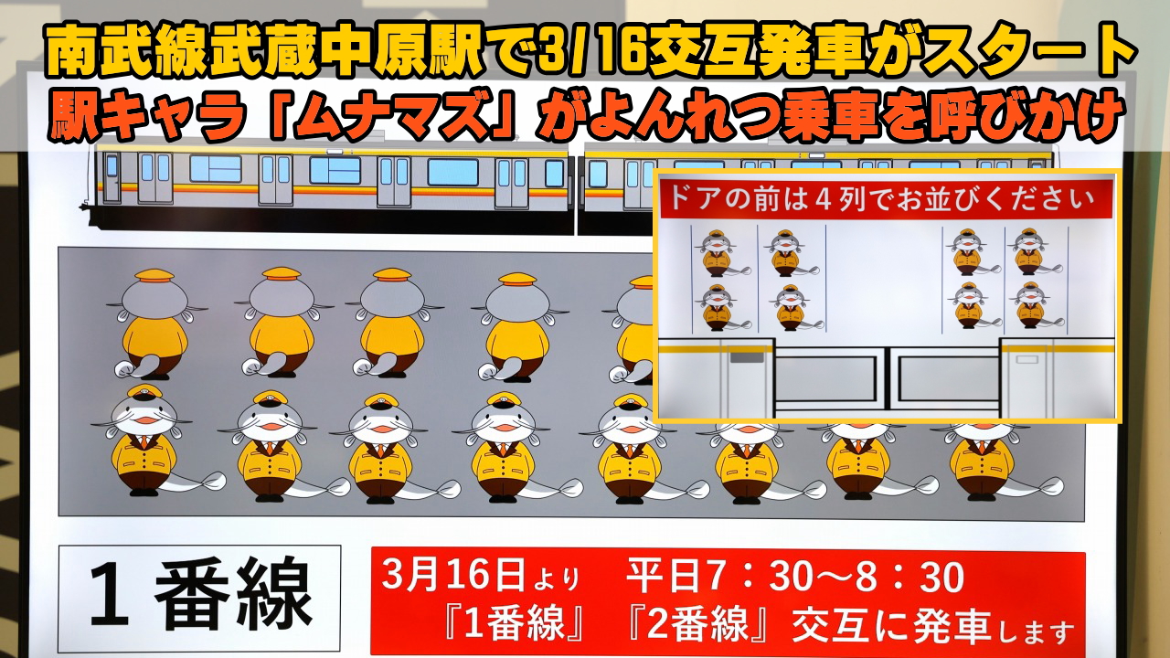 ■武蔵小杉ライフ公式Youtubeチャンネル JR南武線武蔵中原駅で「平日朝ラッシュ川崎行交互発車」3/16開始、ムナマズが「よんれつ待機」を呼びかけ