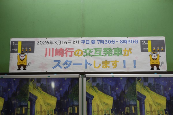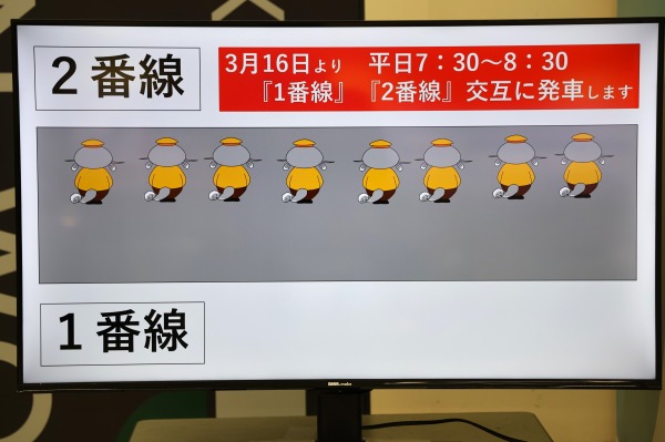 川崎方面行は1番線・2番線で、これまで1番線が主に使われてきたわけですが、3月16日以降の朝ラッシュ時は2番線も使って交互に発車するかたちになります。