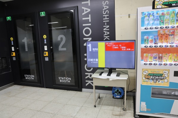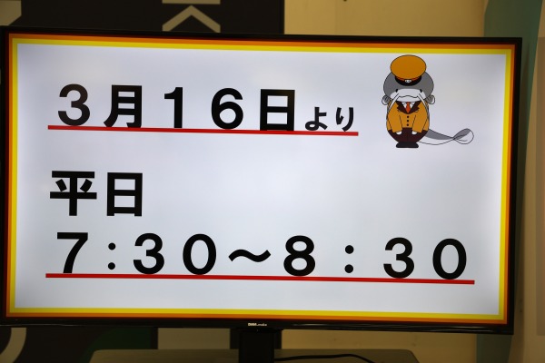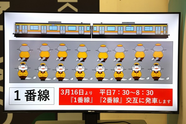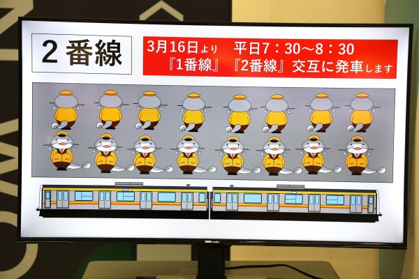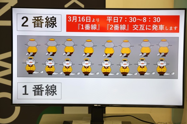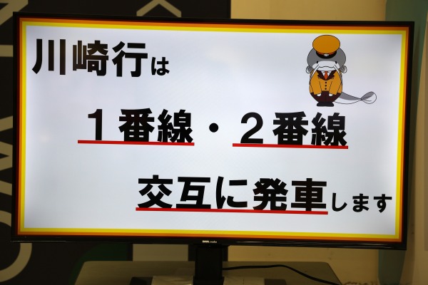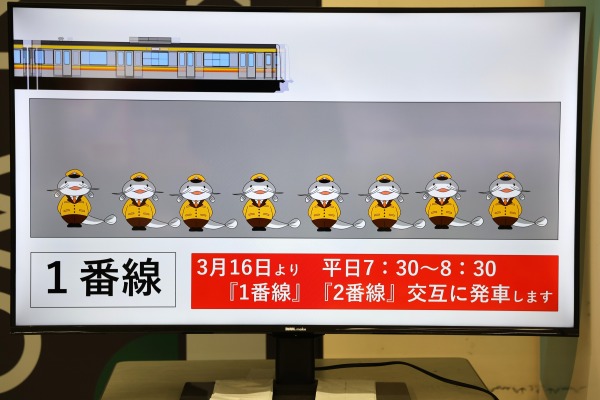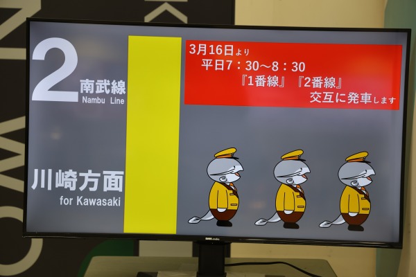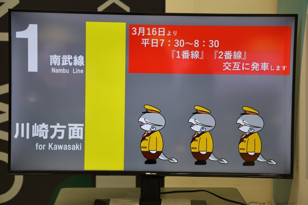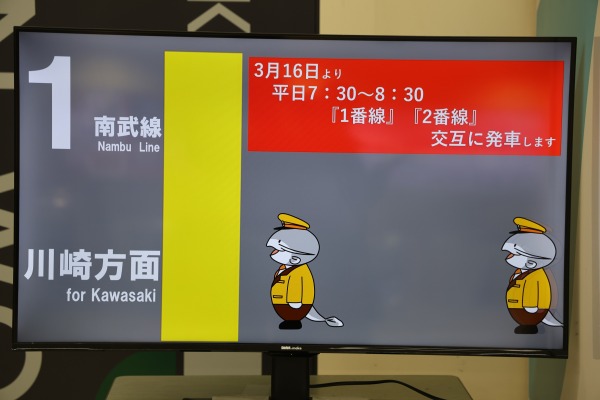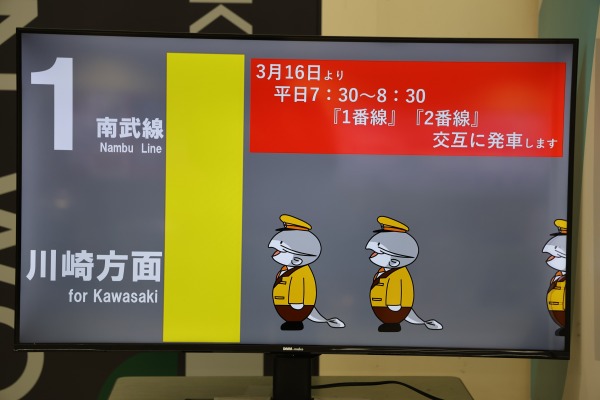 モニター映像では、武蔵中原駅のキャラクター「ムナマズ」が3/16からの平日朝ラッシュ時(7:30~8:30)の川崎行き交互発車を告知していました。