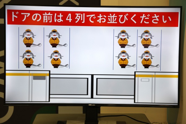同駅コンコースでは、駅キャラクター「ムナマズ」が交互発車の導入告知と、待機列での「よんれつ行列」の呼びかけを行っています。