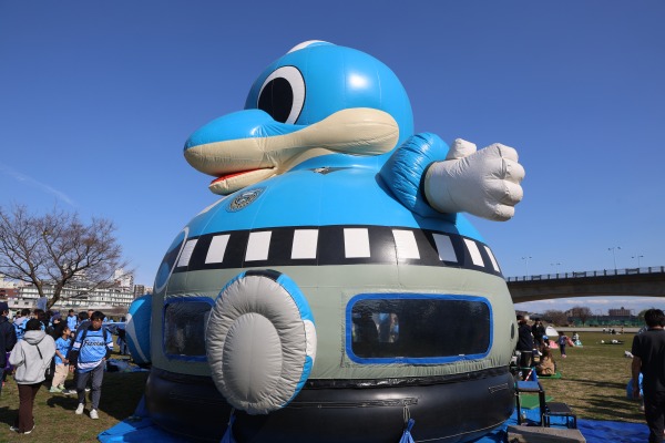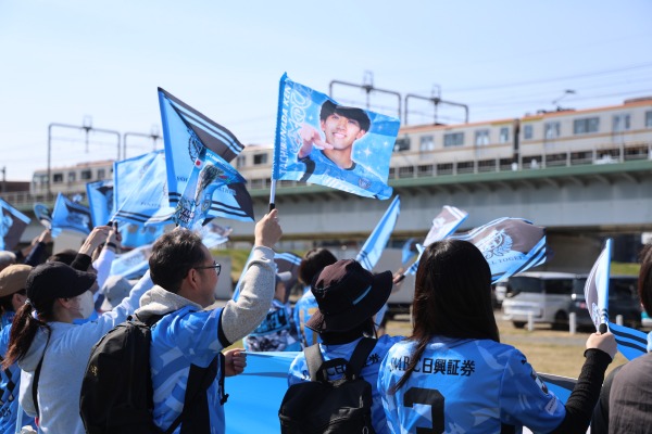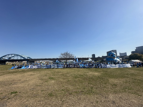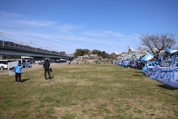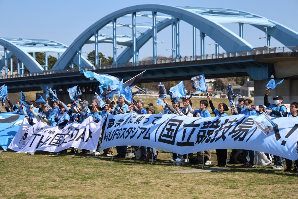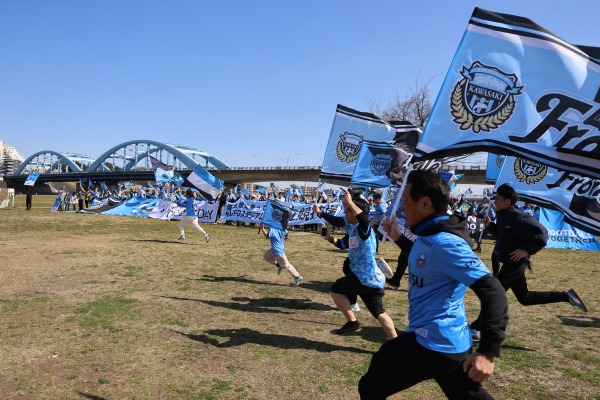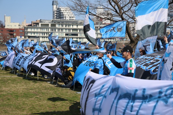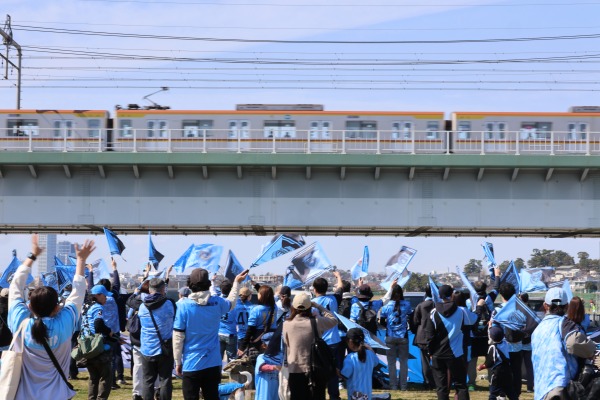 ■川崎フロンターレが3/22マリノス戦国立競技場開催をPR、サポーター238人が多摩川から東急の車窓に