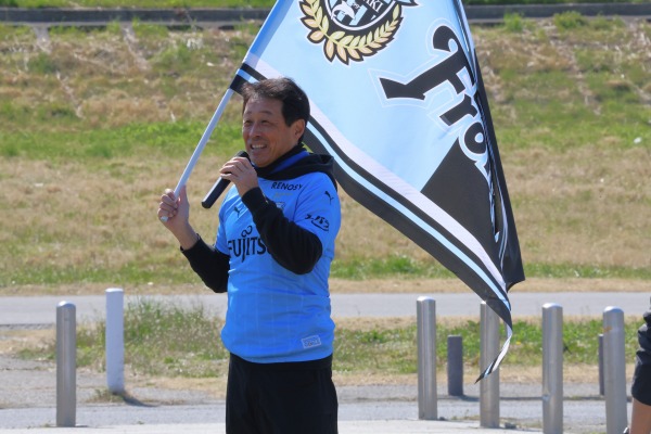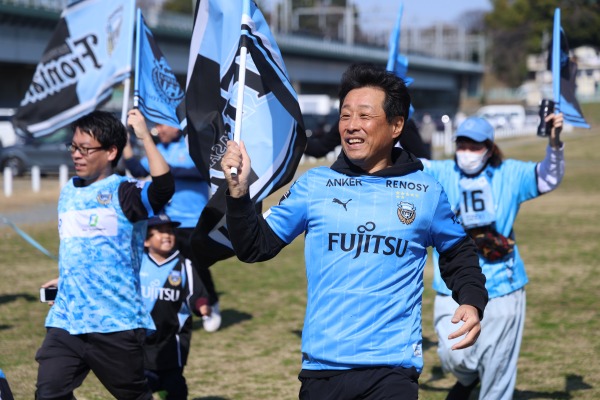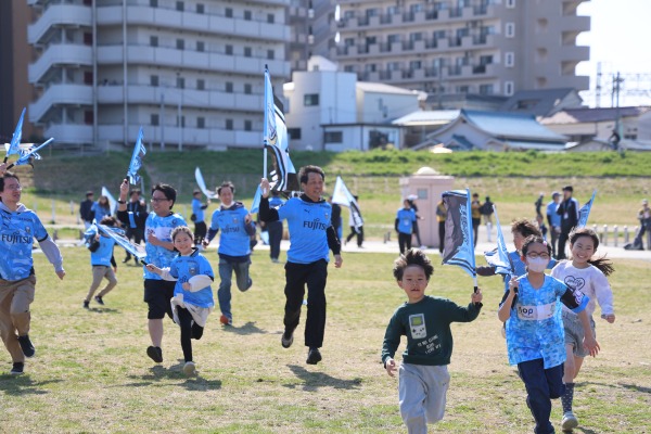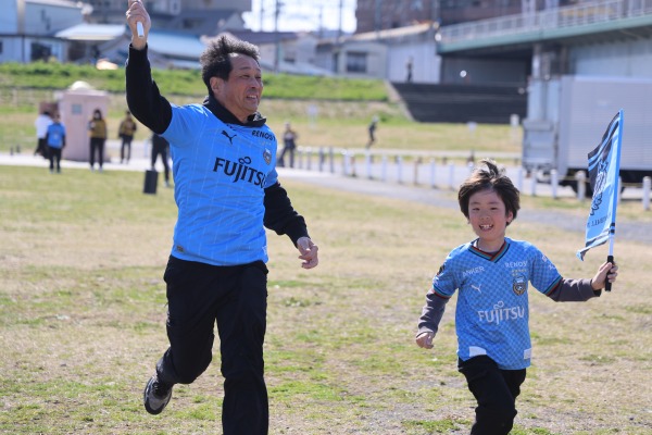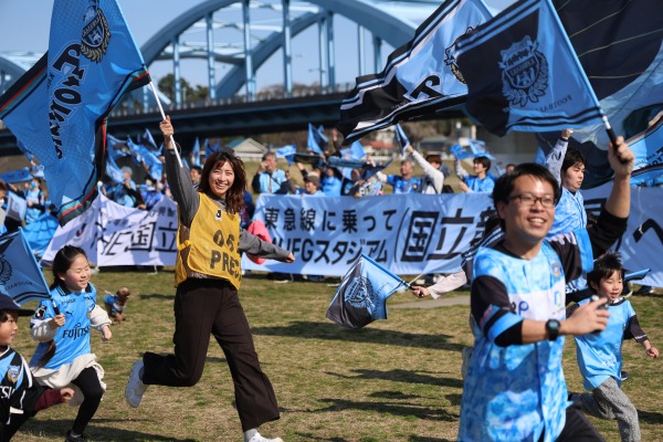 そして川崎フロンターレの吉田明宏社長やクラブスタッフの皆さん、そして参加したサポーター有志の皆さんがフラッグを手に、東急線を追いかけて多摩川河川敷を激走しました。