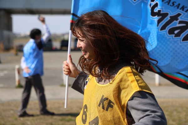 本日取材で来ていた、川崎フロンターレ応援番組MCの奥田明日美さんも、急遽フラッグを持ってダッシュ2本を決めました。