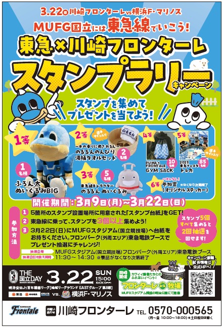 さらに東急線の車内広告にも川崎フロンターレの「THE国立DAY」が展開されているほか、3月9日から22日当日まで「東急×川崎フロンターレスタンプラリー」がスタートしています。