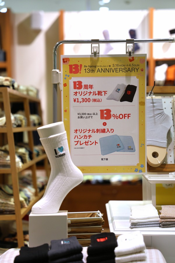同店では「13th Anniversary」のキービジュアルが刺繍された「13th靴下」や、「『I♡小杉』靴下」(それぞれ1,300円)の販売がスタートしました。