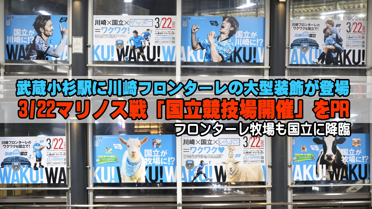 武蔵小杉駅に川崎フロンターレ「THE国立DAY」PR装飾が登場、国立競技場3/22開催マリノス戦にフロンターレ牧場も降臨