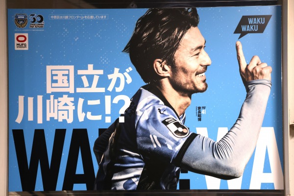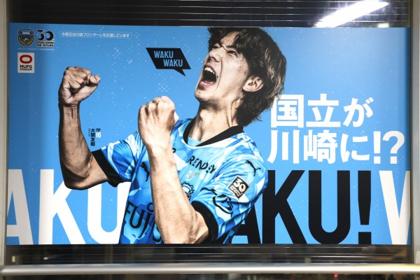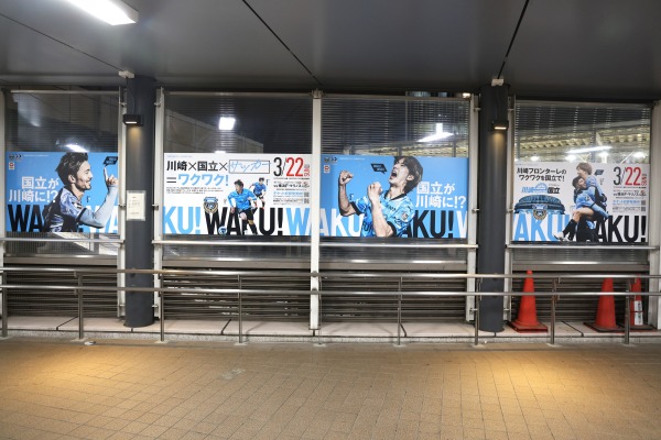 一方、連絡通路の東側は川崎フロンターレの選手らが中心で、サッカーの試合として王道の告知スタイルとなっています。