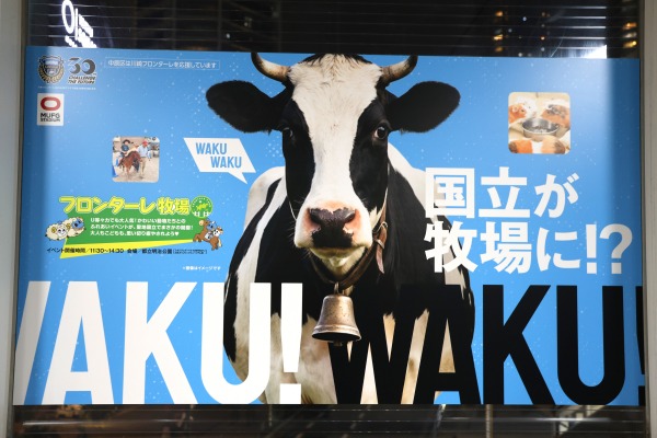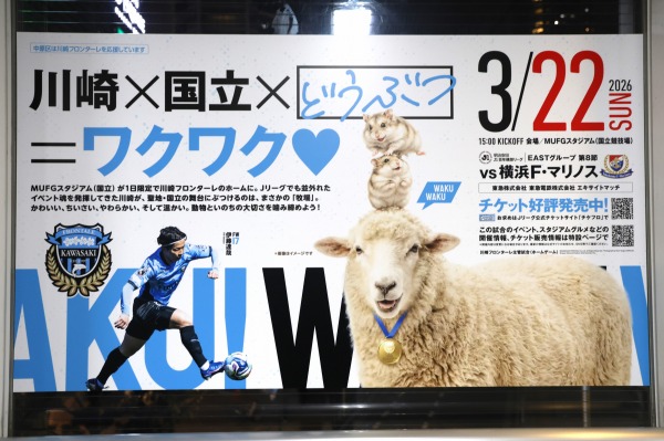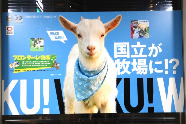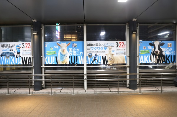 「フロンターレ牧場」の告知として武蔵小杉駅の連絡通路にはヤギや羊、牛の巨大な写真が並び、「国立が、牧場に!?」という驚きの展開を予告しています。
