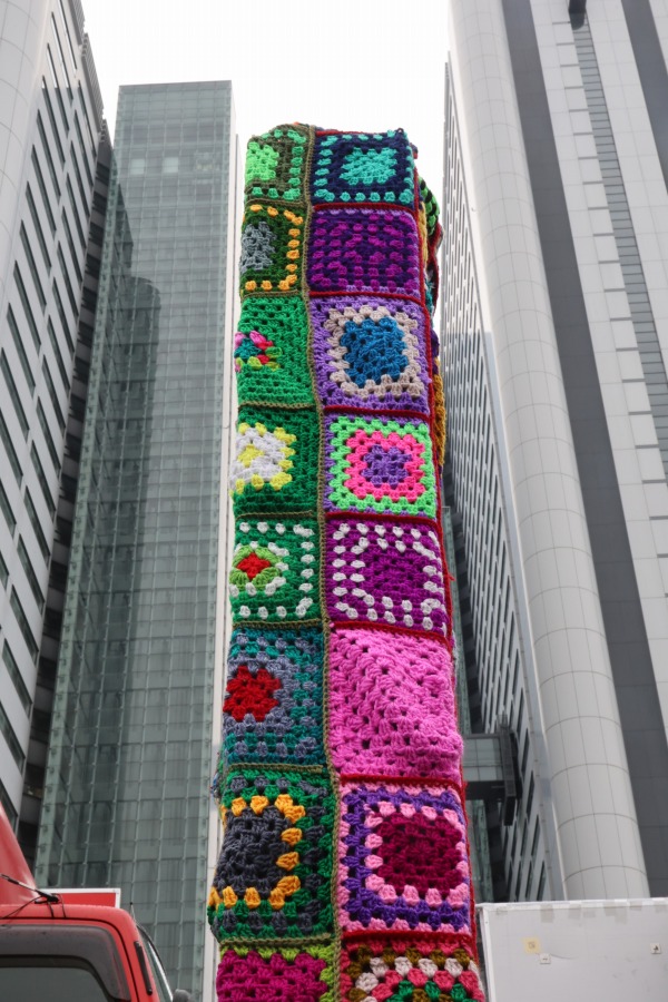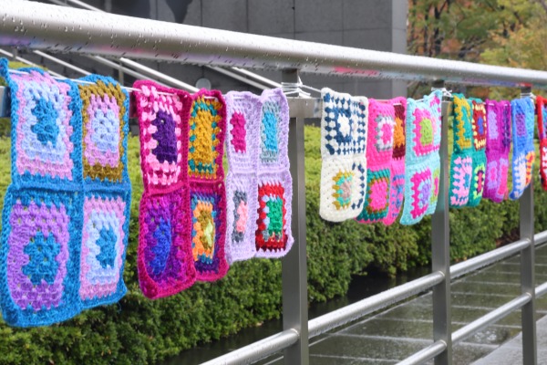 ヤーンボミングとは、編み物で街角などの空間を装飾するアート活動です。
