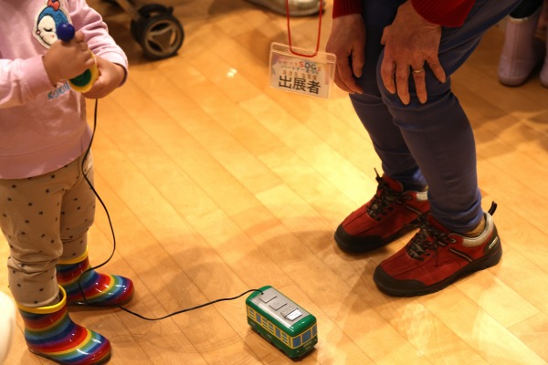 ハンドルを回すと発電でき、電車の模型が動きます。